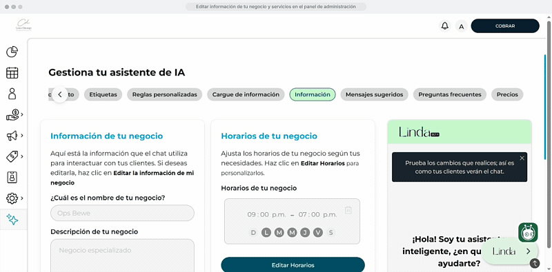 Horarios de atención: ¡Crucial! Para que Linda sepa cuándo estás disponible o cuándo está abierto el local.