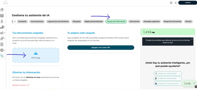 Aquí es donde Linda se vuelve realmente potente. Sabemos que hay detalles de tu negocio que son difíciles de resumir en una línea de texto. Por eso, dentro del módulo encontrarás la sección "Cargue de información".