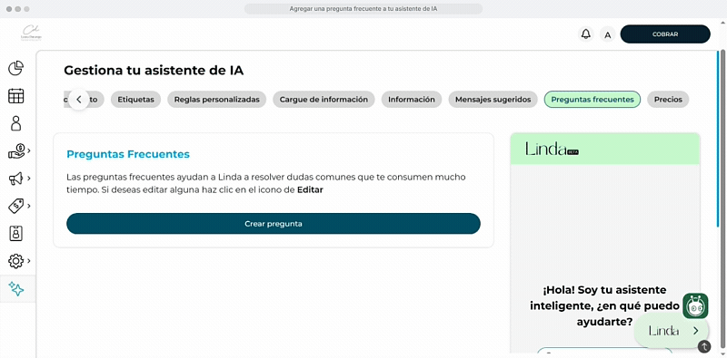 Esta es la forma más directa de entrenar a Linda. Identifica las 10 preguntas más comunes que reciben en tu negocio y añade la respuesta precisa en la sección de Preguntas Frecuentes. Esto garantiza que Linda esté siempre preparada para las consultas clave.