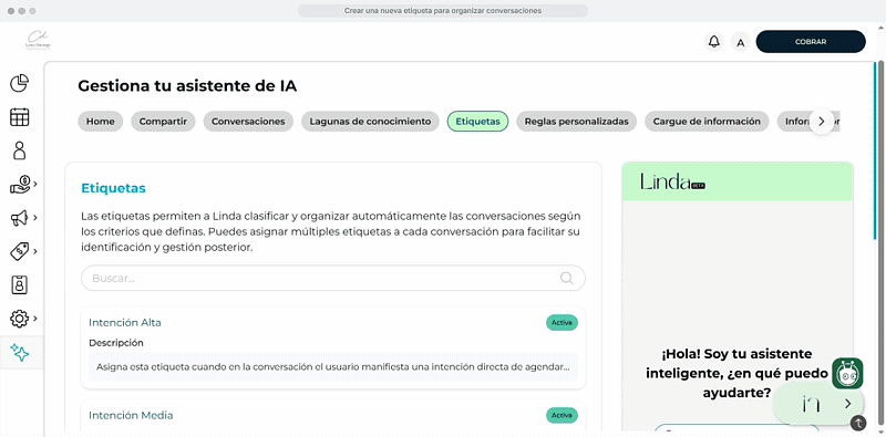Las etiquetas permiten a Linda clasificar y organizar automáticamente las conversaciones según los criterios que definas. Puedes asignar múltiples etiquetas a cada conversación para facilitar su identificación y gestión posterior.