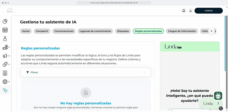 Las Reglas Personalizadas te permiten definir cómo quieres que Linda se exprese, ajustando el tono, el lenguaje y el estilo de comunicación.
