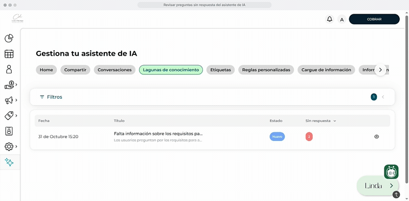 Las Lagunas de Conocimiento son el feedback directo de tus clientes. Es la forma en que Linda te dice: "Hoy tuve estas dudas y no supe qué responder. ¿Me enseñas?"