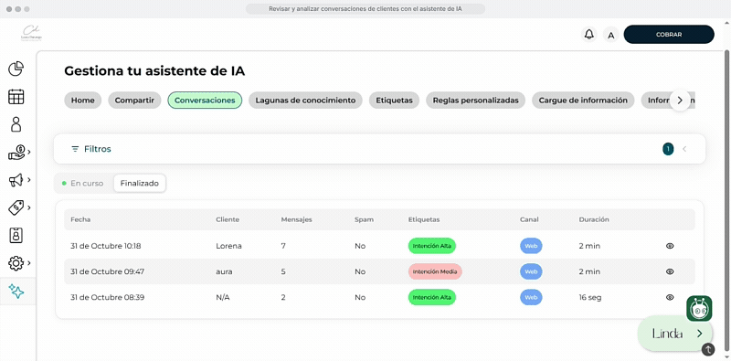 Con este panel, podrás ver cómo interactúan tus clientes con LINDA y tomar decisiones más rápidas y efectivas.